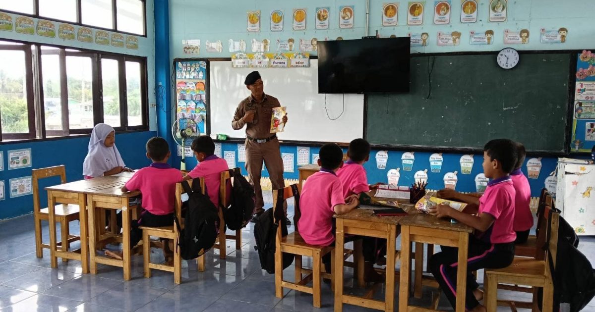 ไปให้ความรู้เกี่ยวกับโทษภัยยาเสพติด ตามโครงการการศึกษาเพื่อการต่อต้านการใช้ยาเสพติดในเด็กนักเรียน( โครงการแดร์ D.A.R.E.)ให้กับเด็กนักเรียน ชั้นป.๕ ณ ร.ร.บ้านตลาดนัดคลองขุด