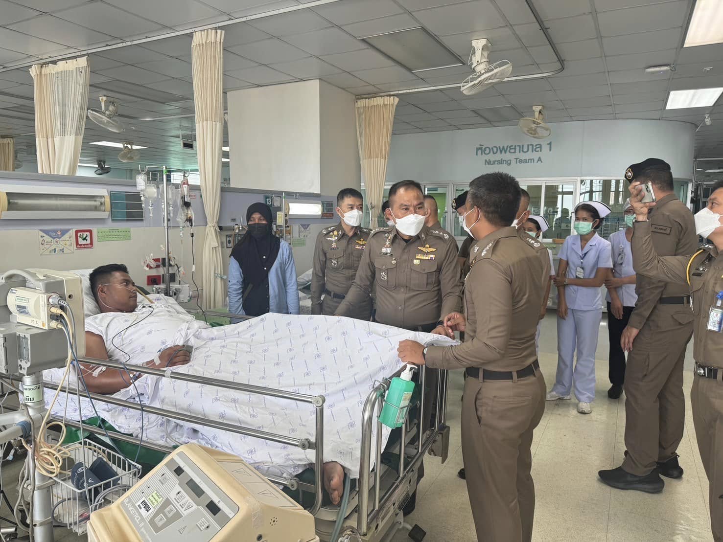 ผกก.สภ.หนองจิก ให้การต้อนรับ พล.ต.ท.ปิยะวัฒน์ เฉลิมศรี ผบช.ภ.9 เยี่ยมอาการบาดเจ็บของ ส.ต.ต.มะไซดี มะแซ ผบ.หมู่ (ป.)สภ.หนองจิก จว.ปัตตานี ซึ่งได้รับบาดเจ็บจากการปฏิบัติหน้าที่ในพื้นที่